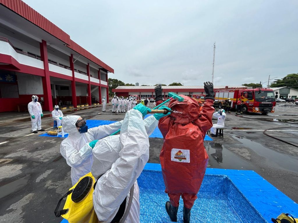 A simulação aplicou técnicas de salvamento, isolamento, evacuação, contenção e descontaminação nos cenários.